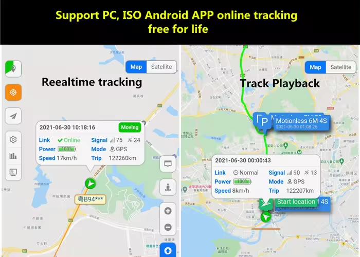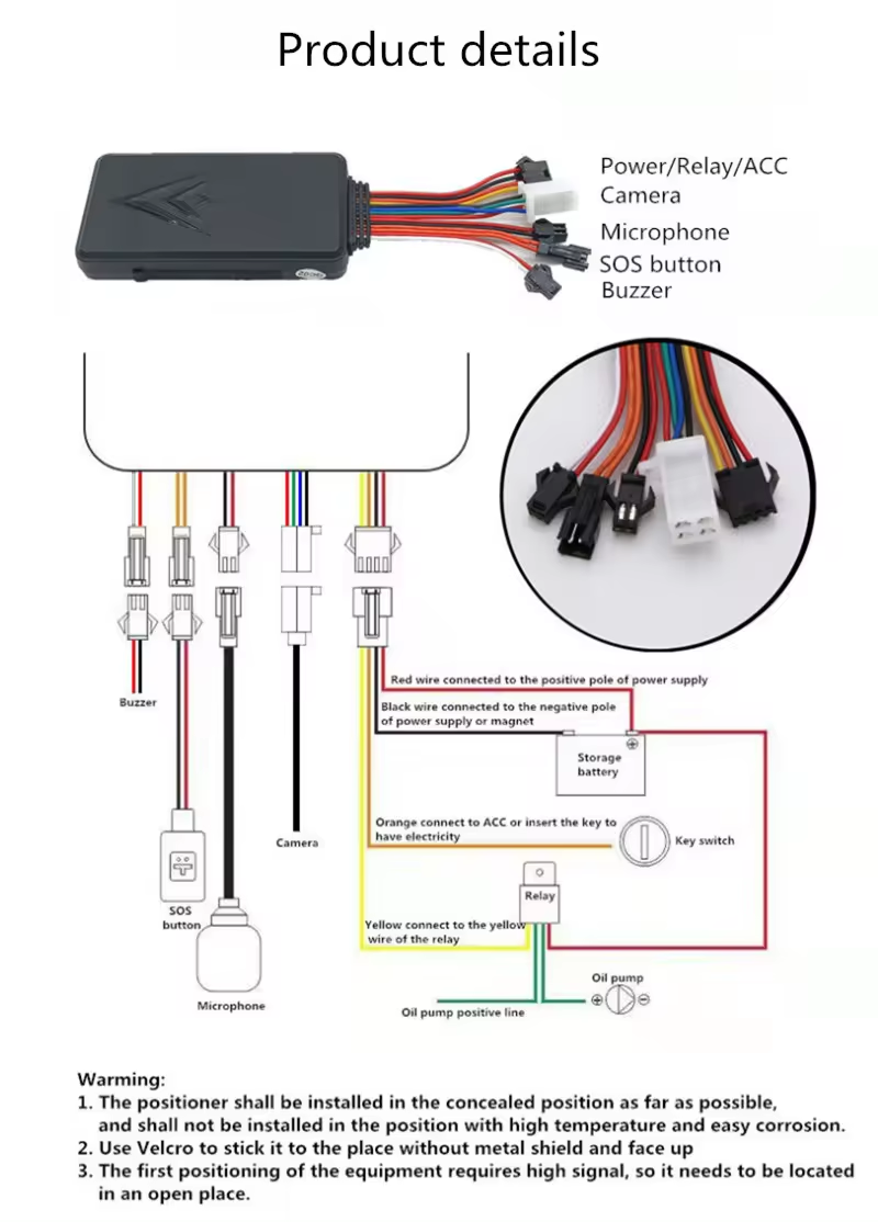 7. SOS for help 8. ACC detection 9. Power outage alarm 10. Overspeed alarm 11. Vibration alarm 12. Displacement alarm 13. ACC
